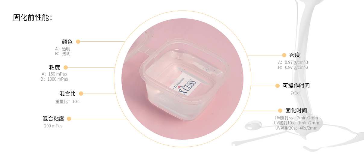 雙組份,10:1比例混合; 低粘度;室溫下快速固化(UV激活后); 低硬度(shore 00); 可通過熒光燈實現(xiàn)工藝控制(含UV示蹤劑)。