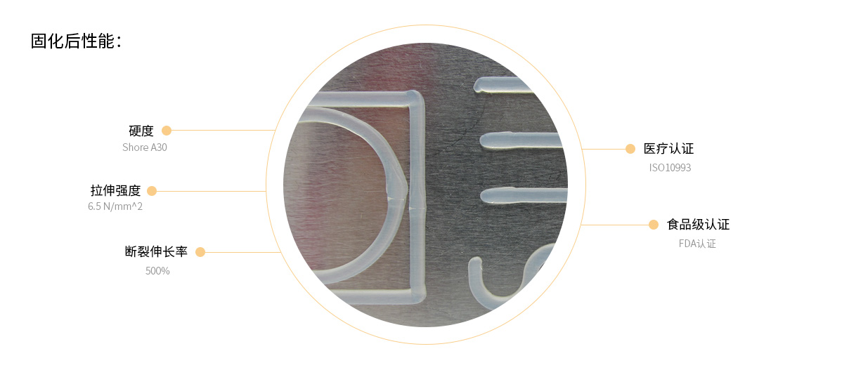 單組份室溫固化; 無塌陷自流平; 粘結強度優(yōu)異,特別是對硅橡膠具有優(yōu)異的粘結強度; 醫(yī)療級。